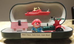Daneben wird Hausherr Werner Schlegel erstmals öffentlich 15 seiner nicht minder witzigen, u.a. aus Plastikabfällen und Überraschungseier–Figuren gefertigten Montagen und Mini-Skulpturen präsentieren.